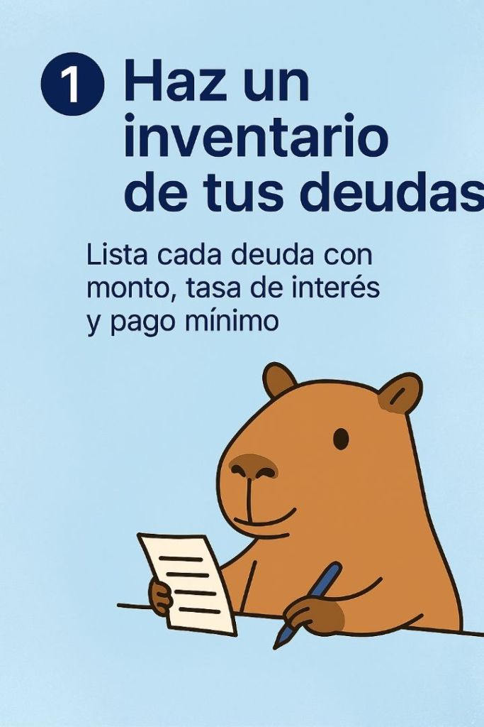 – Lista cada deuda con monto, tasa de interés y pago mínimo.